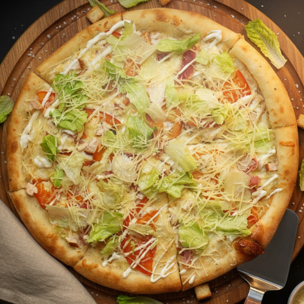 Филе куриное копченое, салат Айсберг, сливочный соус, Гауда, Моцарелла, Пармезан, томаты, бекон, соус Цезарь