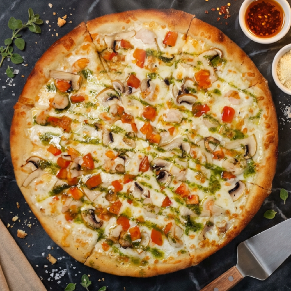 Креветка, Моцарелла, Гауда, сливочный соус, Шампиньоны, томаты, соус Песто