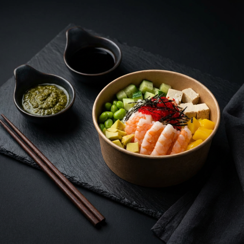 Рис, Тигровые креветки, Копчёный сыр Тофу, манго, бобы Эдамаме, авокадо, огурец, нори. Подаётся с соусом Песто собственного производства и Соевым соусом