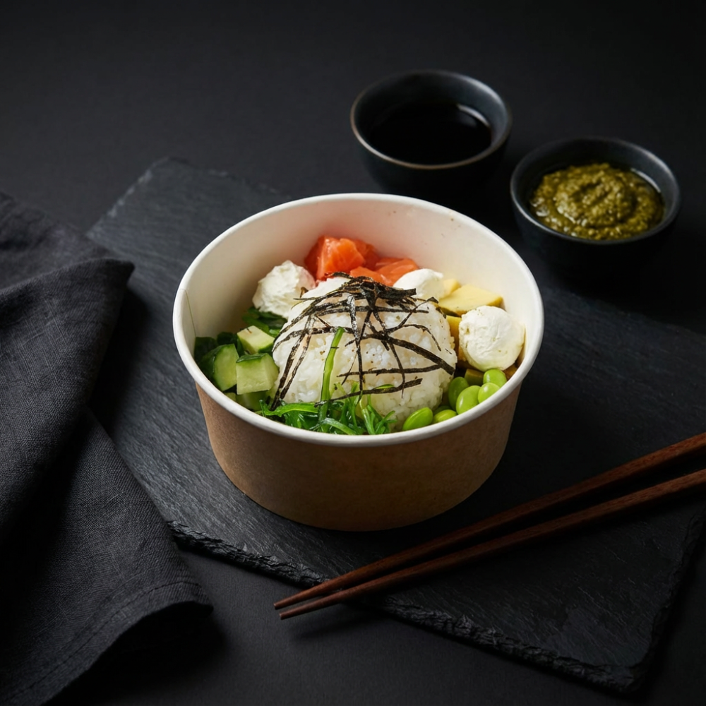 Рис, Лосось, салат Чука, бобы Эдамаме, авокадо, сыр творожный, огурец, нори. Подаётся с соусом Песто собственного производства и Соевым соусом