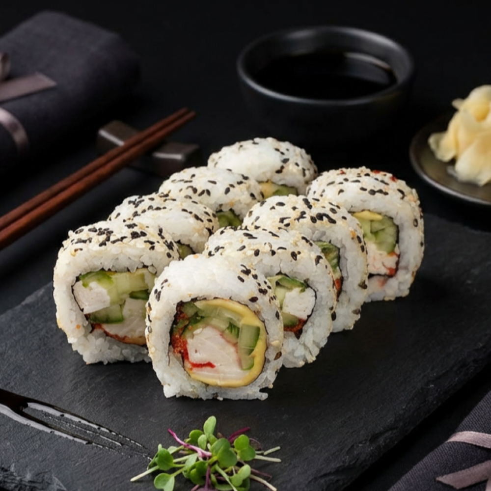 Яркое сочетание снежного краба и плавленного сыра Чеддер с хрустящим огурцом и икрой Масаго