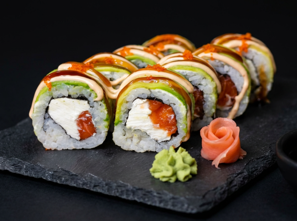 Лосось, сливочный сыр, авокадо, икра Масаго, соус Унаги, соус Спайси