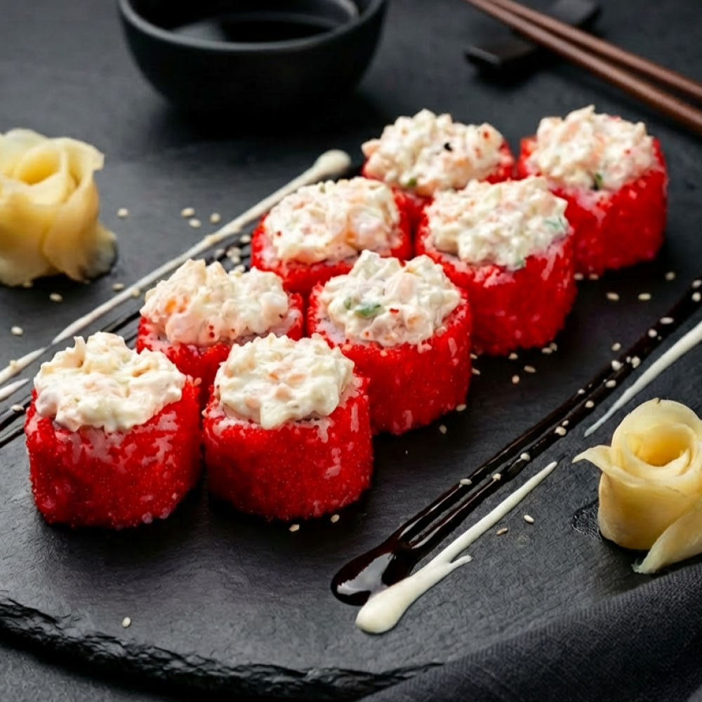 Шапочка из ароматной креветки с зеленым луком и соусом, внутри сливочный сыр и омлет, снаружи икра масаго