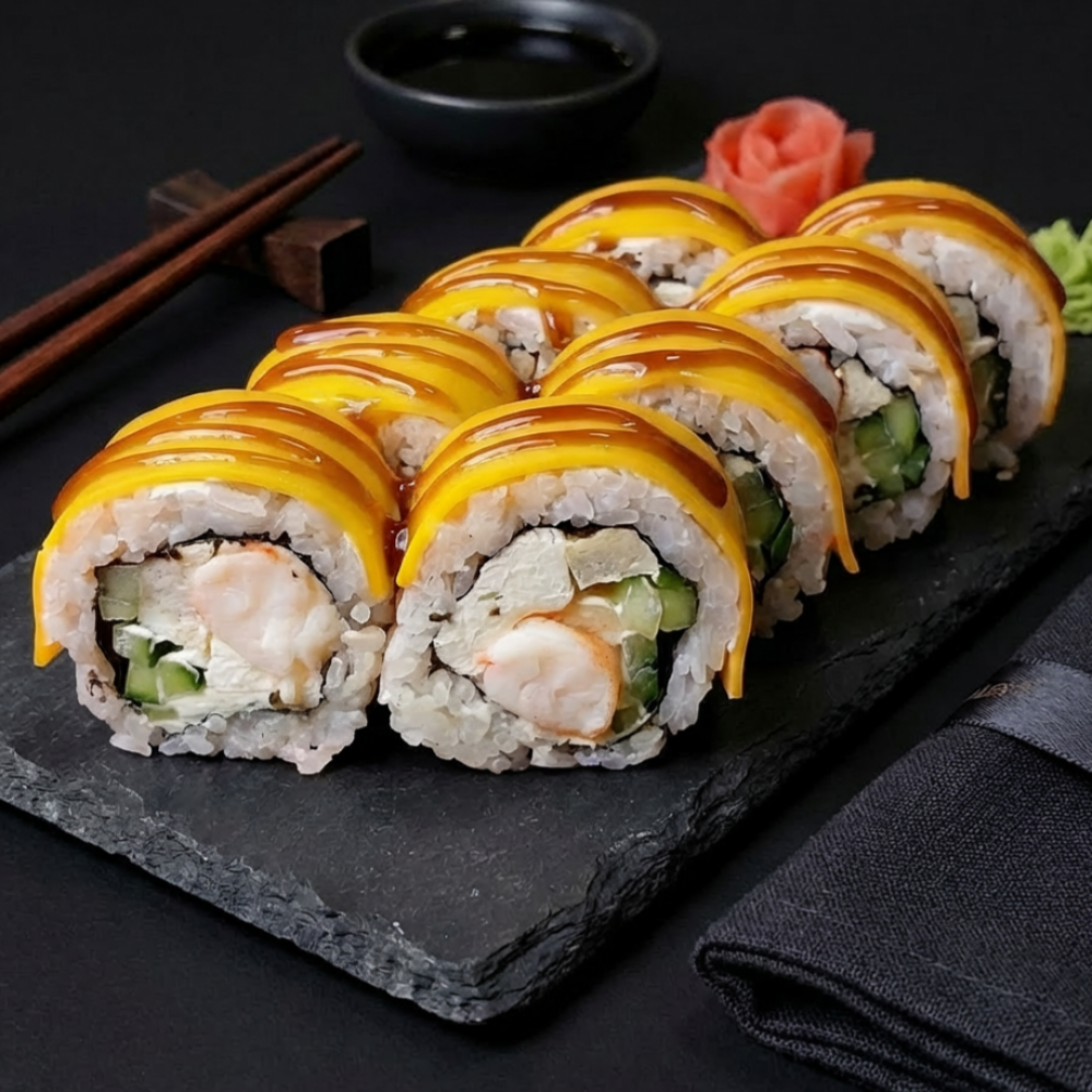 Тигровая креветка, японский омлет, сливочный сыр, сыр чеддер, соус Унаги