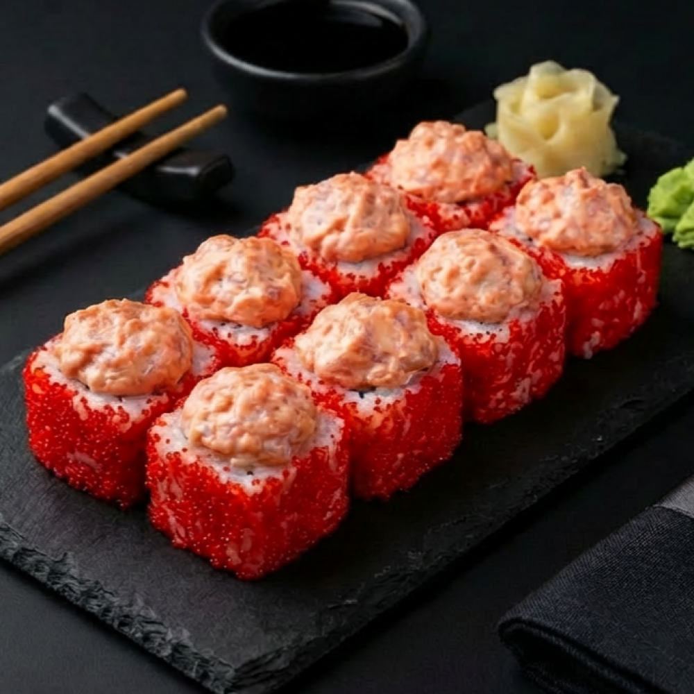 Острый ролл с шапочкой из тунца в соусе спайси, внутри сливочный сыр и омлет, снаружи икра масаго