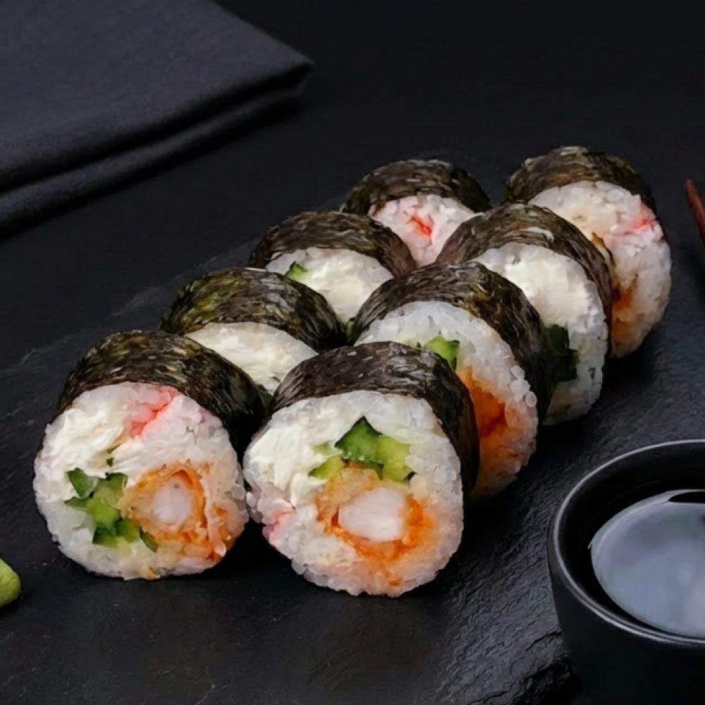 Креветка Темпура, сливочный сыр, снежный краб, зеленый лук, соус Шрирача