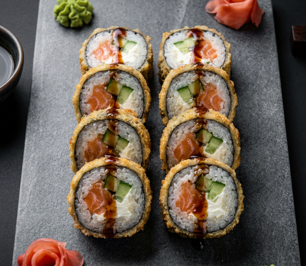Жареный ролл с лососем, снежным крабом, сливочным сыром и хрустящим огурцом в темпурной панировке