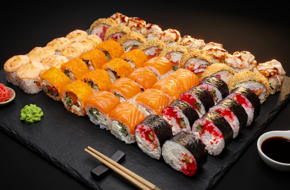 Филадельфия, Калифорния с Лососем, Темпура с Лососем, Запеченный с Лососем, Хот Креветка, Нежный