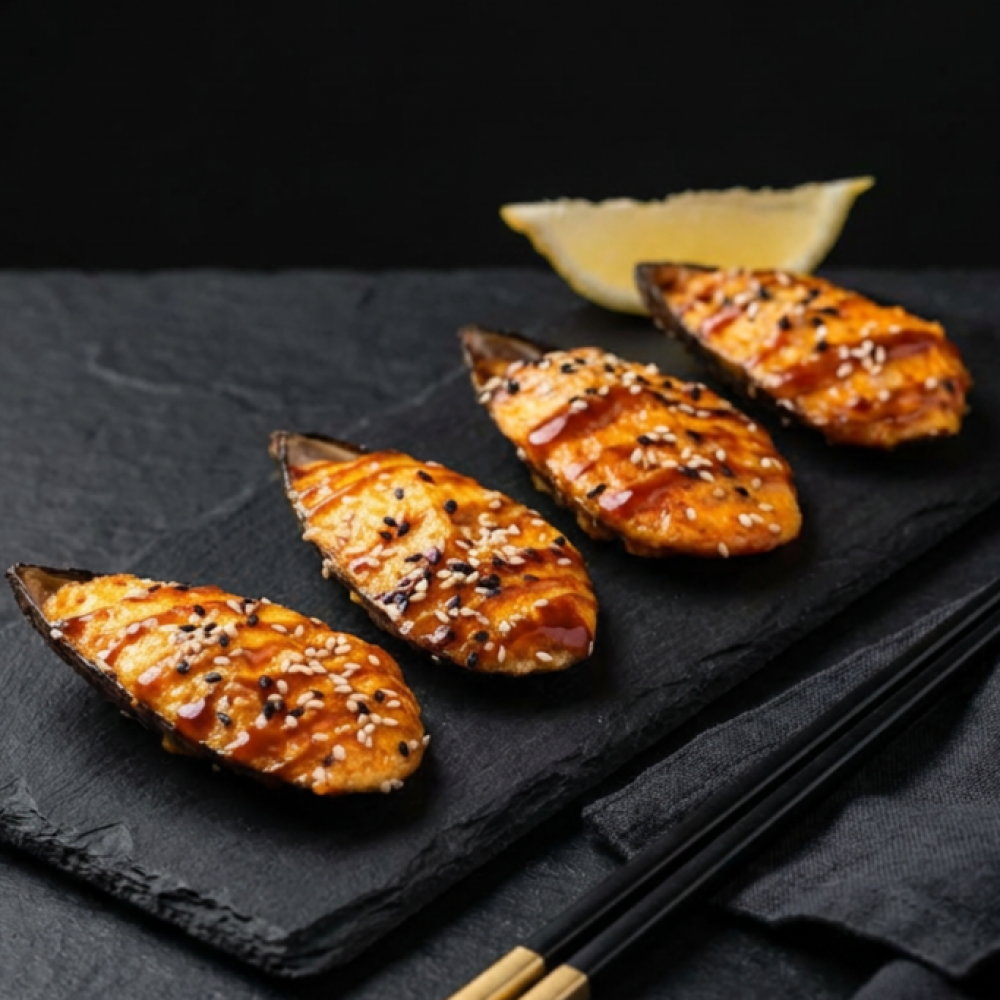Мидии киви 4 шт, фирменный соус, икра масаго, соус унаги, кунжут, долька лимона